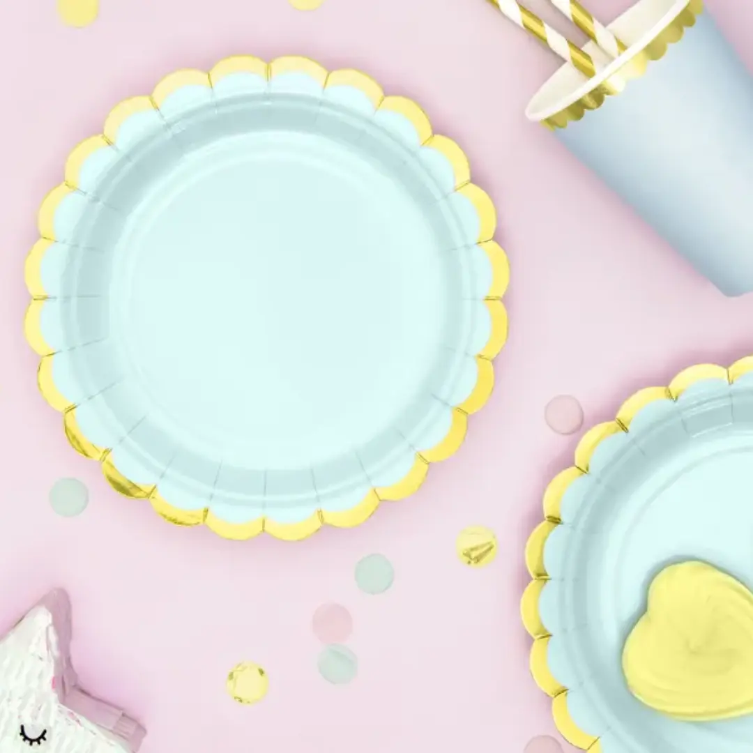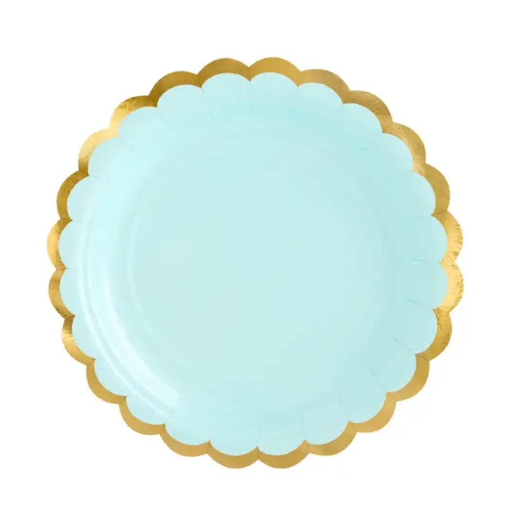 Accueil ▸ Décoration ▸ Nos produits ▸ Décoration de table ▸ Assiettes ▸ 6 Assiettes en Carton Vert Menthe avec Bordures Dorées Métallisées – Ø 18 cm