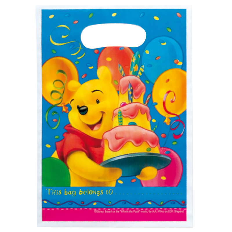 Lot de 6 sachets en plastique imprimés de Winnie L’ourson tenant un gros gâteau d’anniversaire sur un fond bleu.
