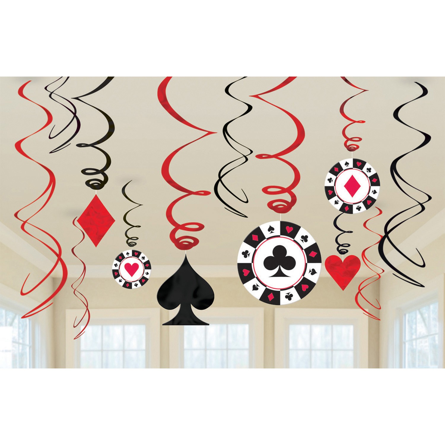 Kit de 12 tourbillons décoratifs rouge et noir de 61cm avec 6 décorations à suspendre au bout (3 de 17.7cm et 3 de 12.7cm).