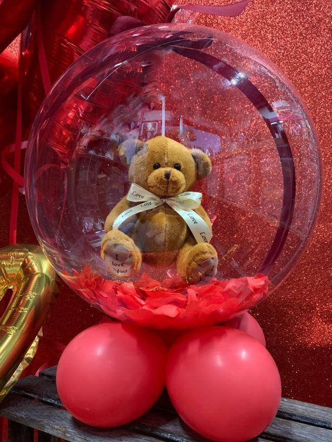 Ballon transparent avec nounours et pétales de roses rouges.