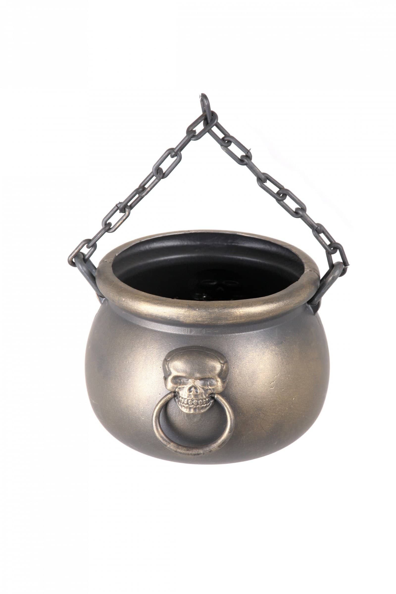 Petit chaudron en plastique avec une tête de mort.