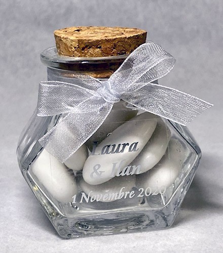 Ce contenant à dragées est en forme d’hexagone en verre avec un bouchon de liège.