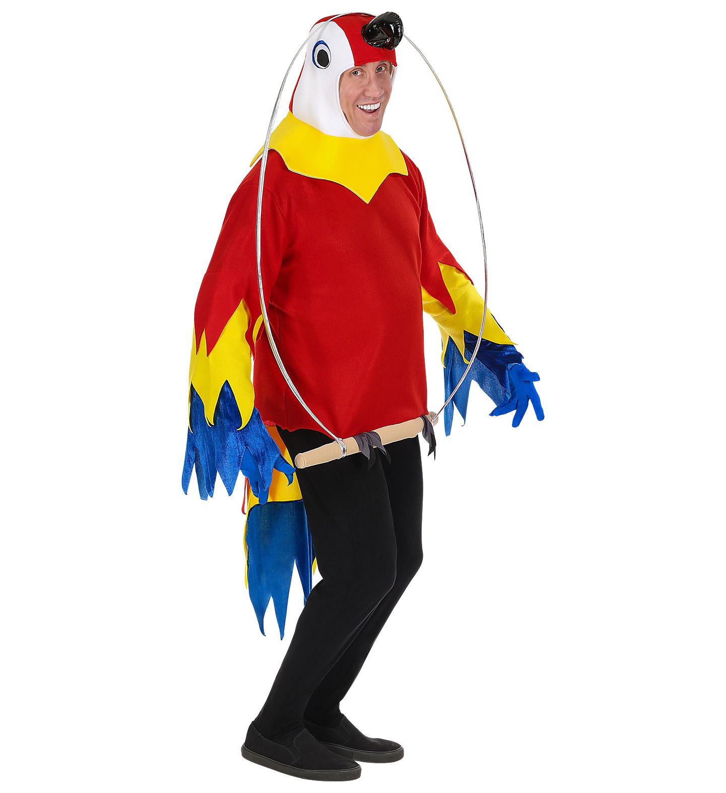 Cet ensemble de perroquet se compose d’un haut rouge avec des manches, d’une queue, d’un col jaune, d’une cagoule tête de perroquet et un anneau donnant l’illusion que le perroquet est perché dessus. (Ne contient pas le pantalon).
