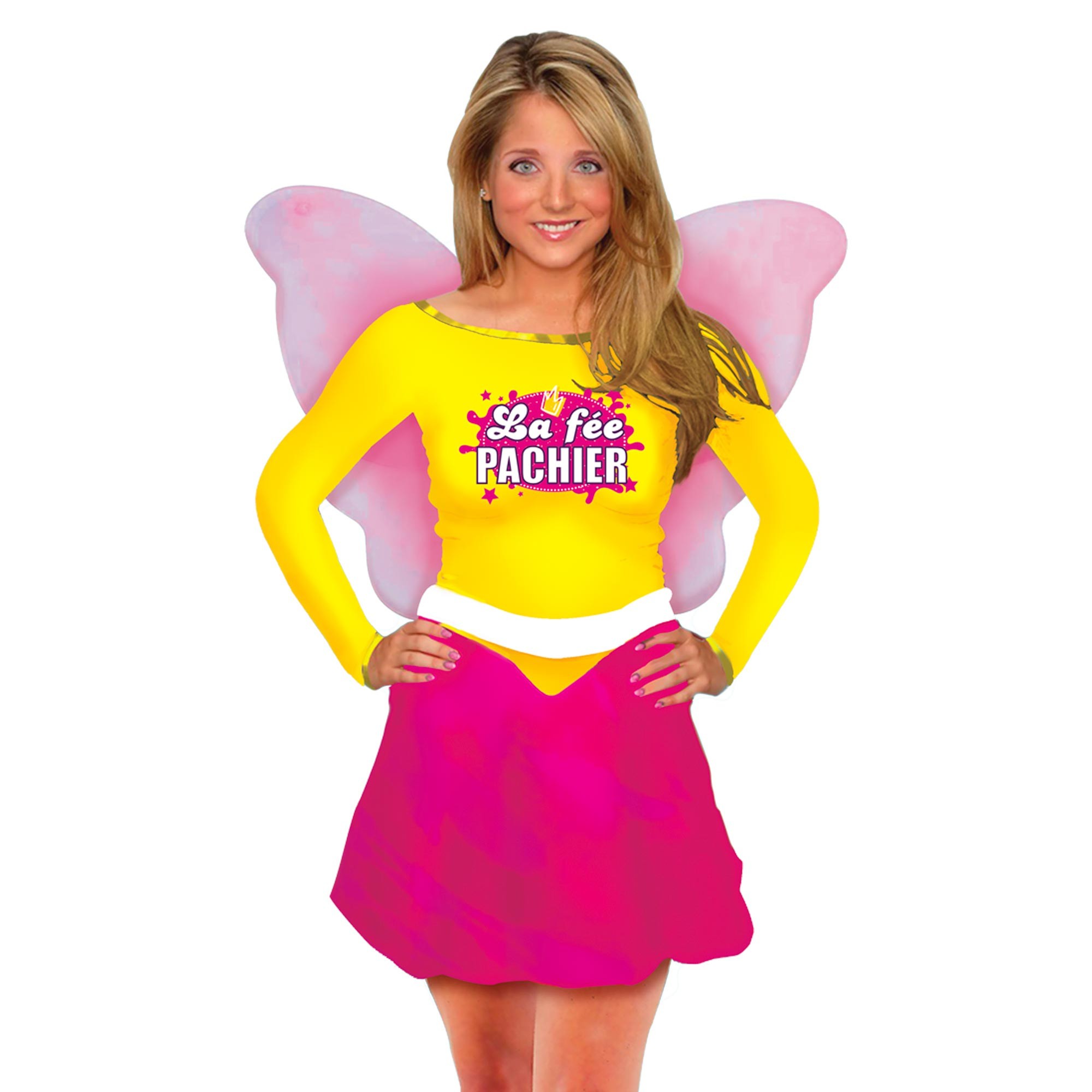 Le déguisement fée pas chier est fabriquée à partir de tissus doux et de qualité qui assurent un confort optimal tout au long de la soirée. La robe est rose et jaune, avec l’inscription « la fée pachier » et d’ailes roses.