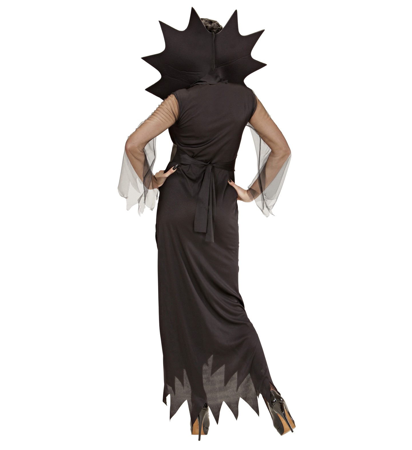 Le déguisement se compose d’une robe noir avec manches en tulles transparentes, et d’une ceinture motif araignée couleur or, accompagné d’un maxi col.
