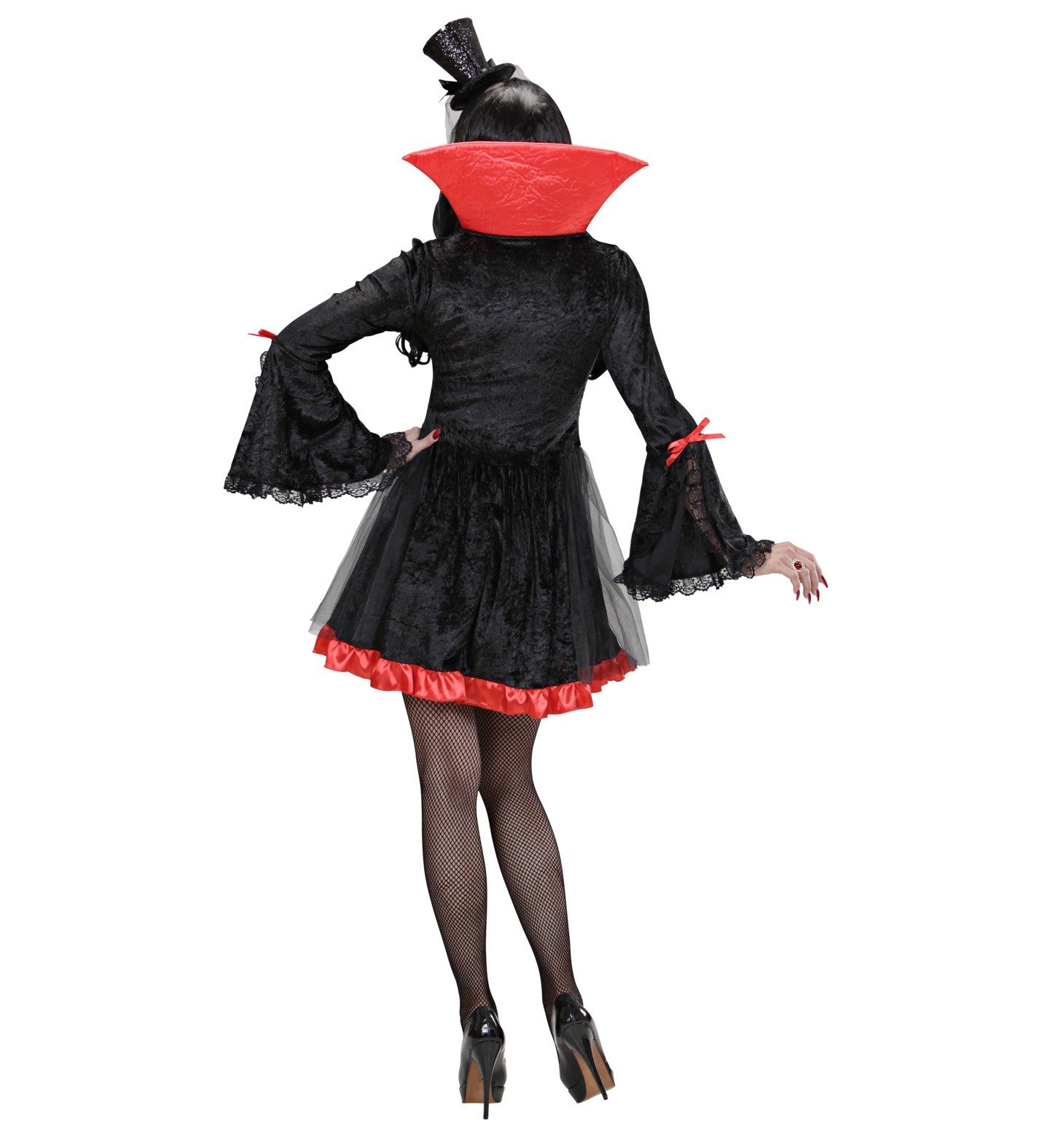 La pièce maîtresse de ce déguisement est une robe de vampire en velours noir somptueux, qui épouse élégamment votre silhouette pour créer un effet saisissant. Le tissu doux et lisse du velours contraste magnifiquement avec le tulle rouge sang, ajoutant une touche de passion et de mystère à votre apparence.
