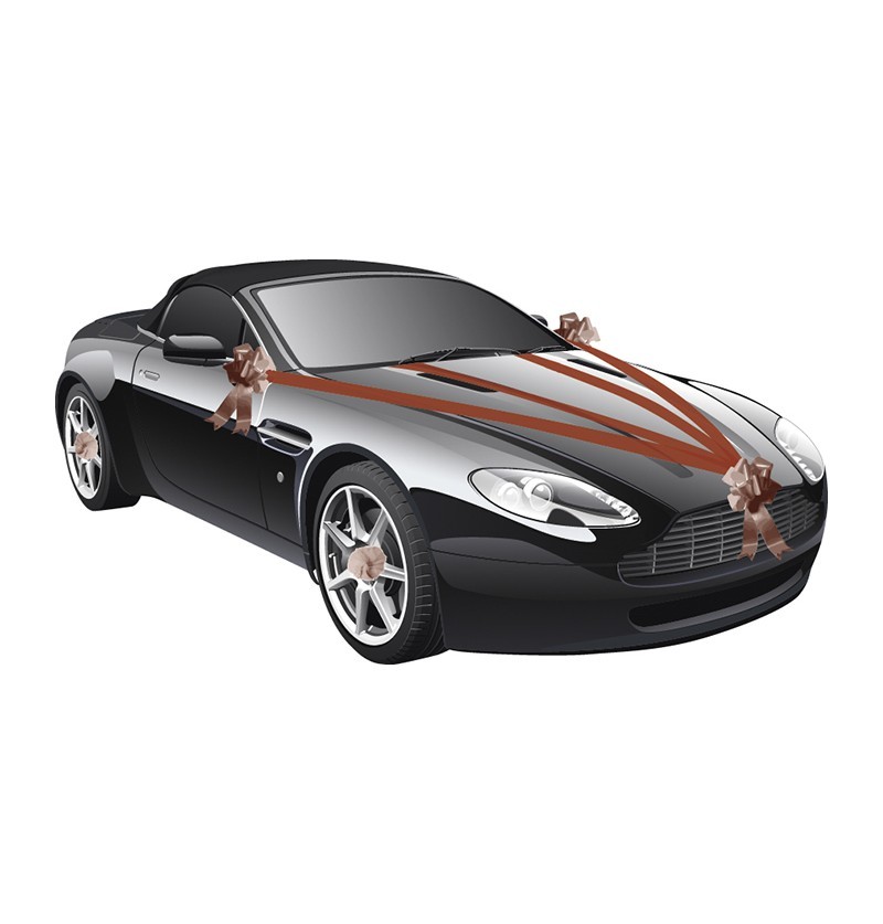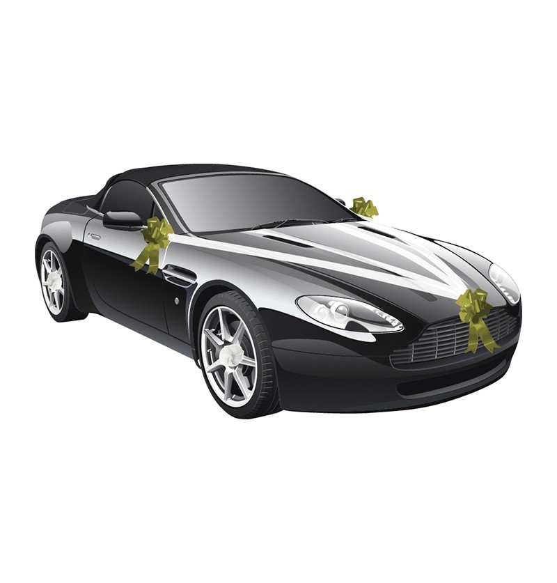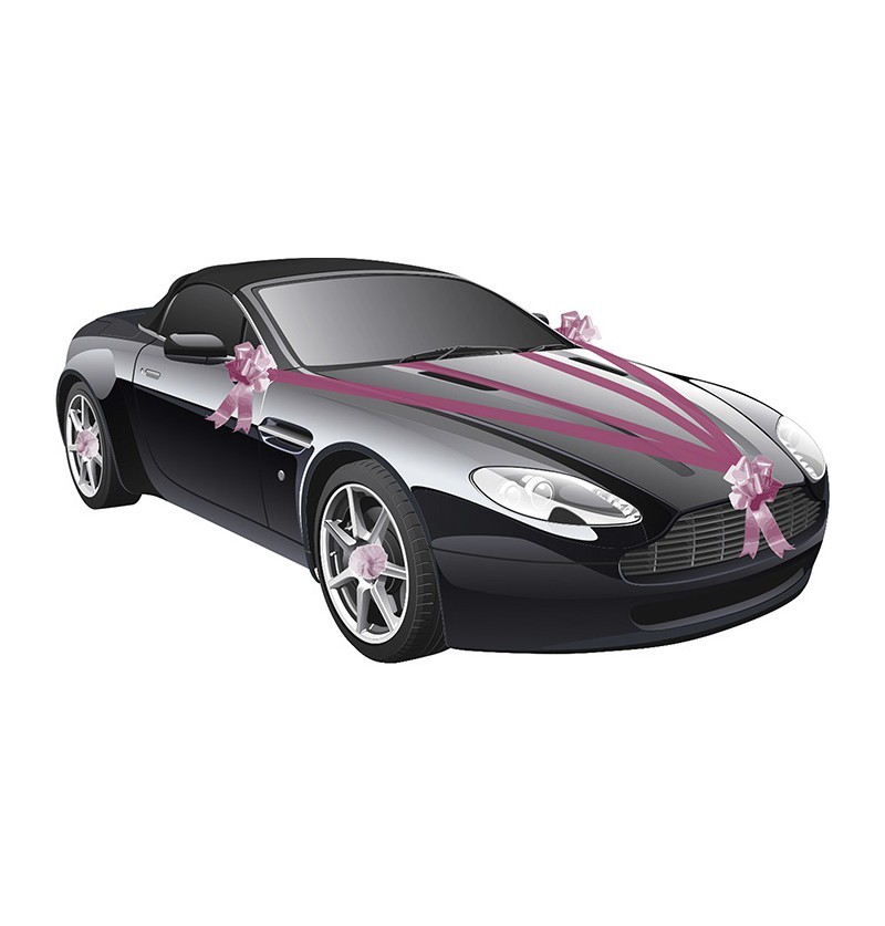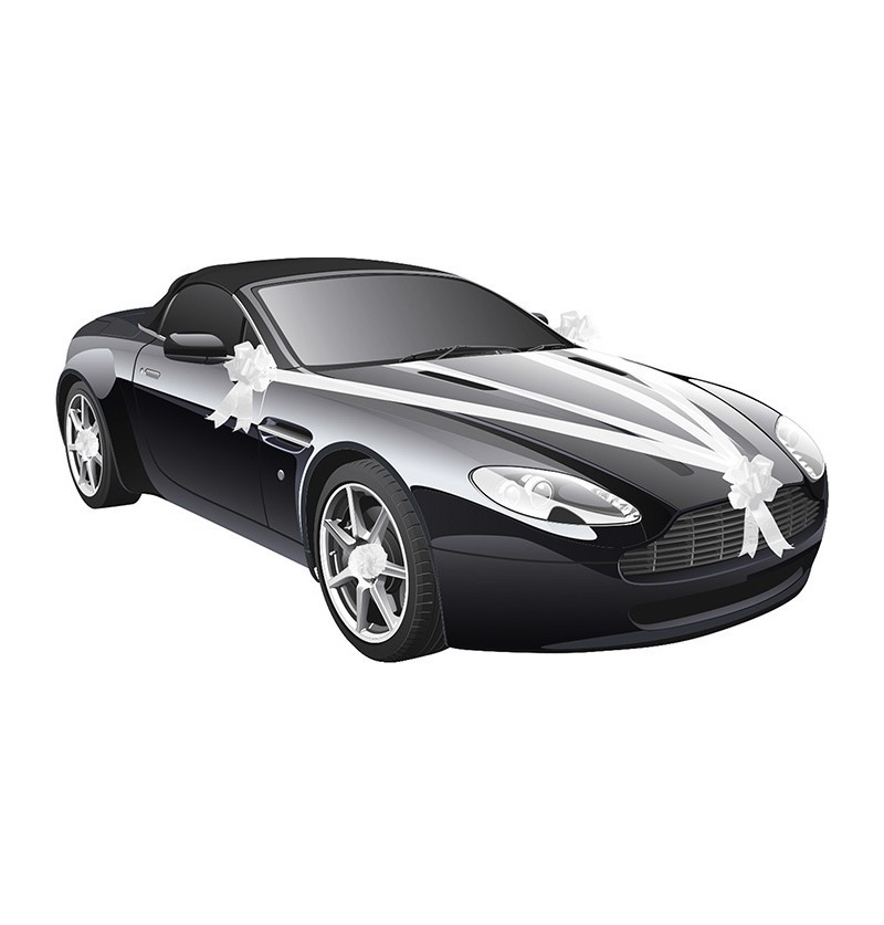 Kit voiture de mariage contenant 2 rouleaux de tulle et 3 nœuds à tirer.