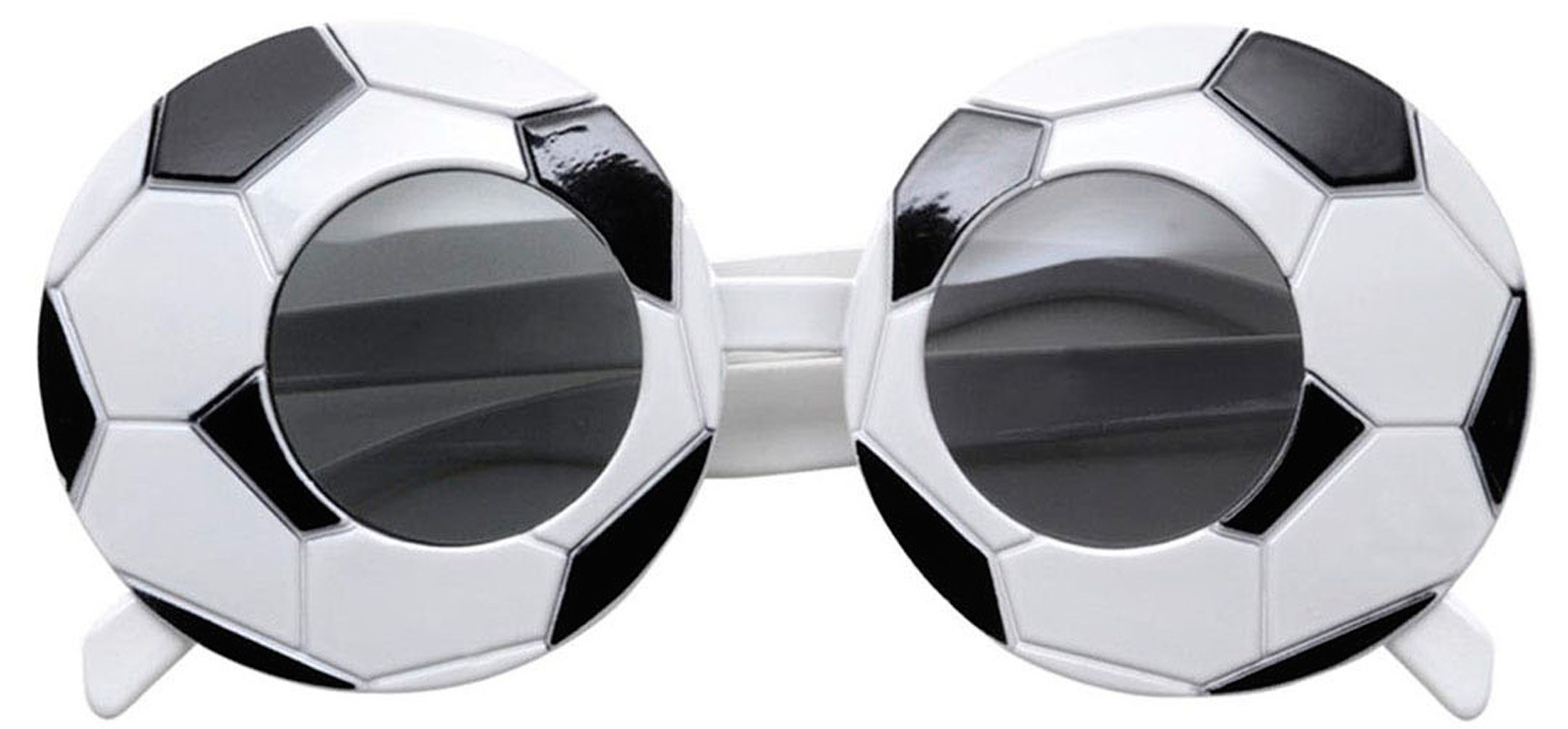 Ces lunettes sont en forme de ballons de foot noires et blanches avec des verres foncés. (Ces lunettes sont un accessoire de déguisement et ne protègent pas des UV).