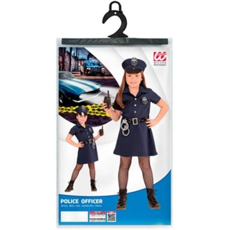 Déguisement de policière pour enfant comportant le chapeau, la ceinture, les menottes, la petite radio et évidemment la robe bleue marine.